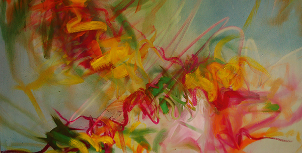 Abschließend bilden sechs Bilder der Serie hier und dort den dritten, hinteren Raum, der zum Träumen einlädt. Auch hier wird die Schichtung dünner Farbe und die Setzung von Markierungen fetter Farbe verwendet. Diese Strukturen wirken teils objekthaft, bilden Konstellationen, verschmelzen mit unendlich scheinenden Farbräumen als Komposition auf der Malfläche, die den gebauten mit Raum mit bestimmen.