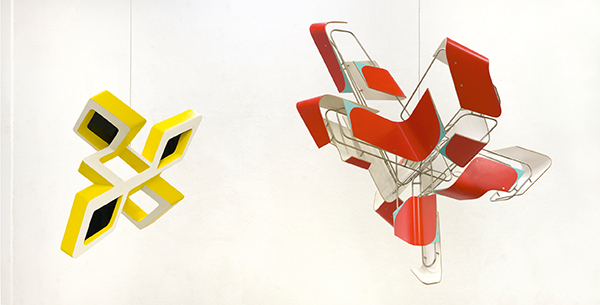 „Red Bouquet“, Holz lackiert und Edelstahlrohr, 130 x 130 x 120 cm, 2022 (rechts)